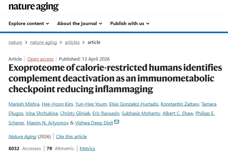 [1] Mishra M, Kim HH, Youm YH, et al. Exoproteome of calorie-restricted humans identifies complement deactivation as an immunometabolic checkpoint reducing inflammaging. Nature Aging. Published online August 6, 2025. doi:10.1038/s43587-026-01107-0