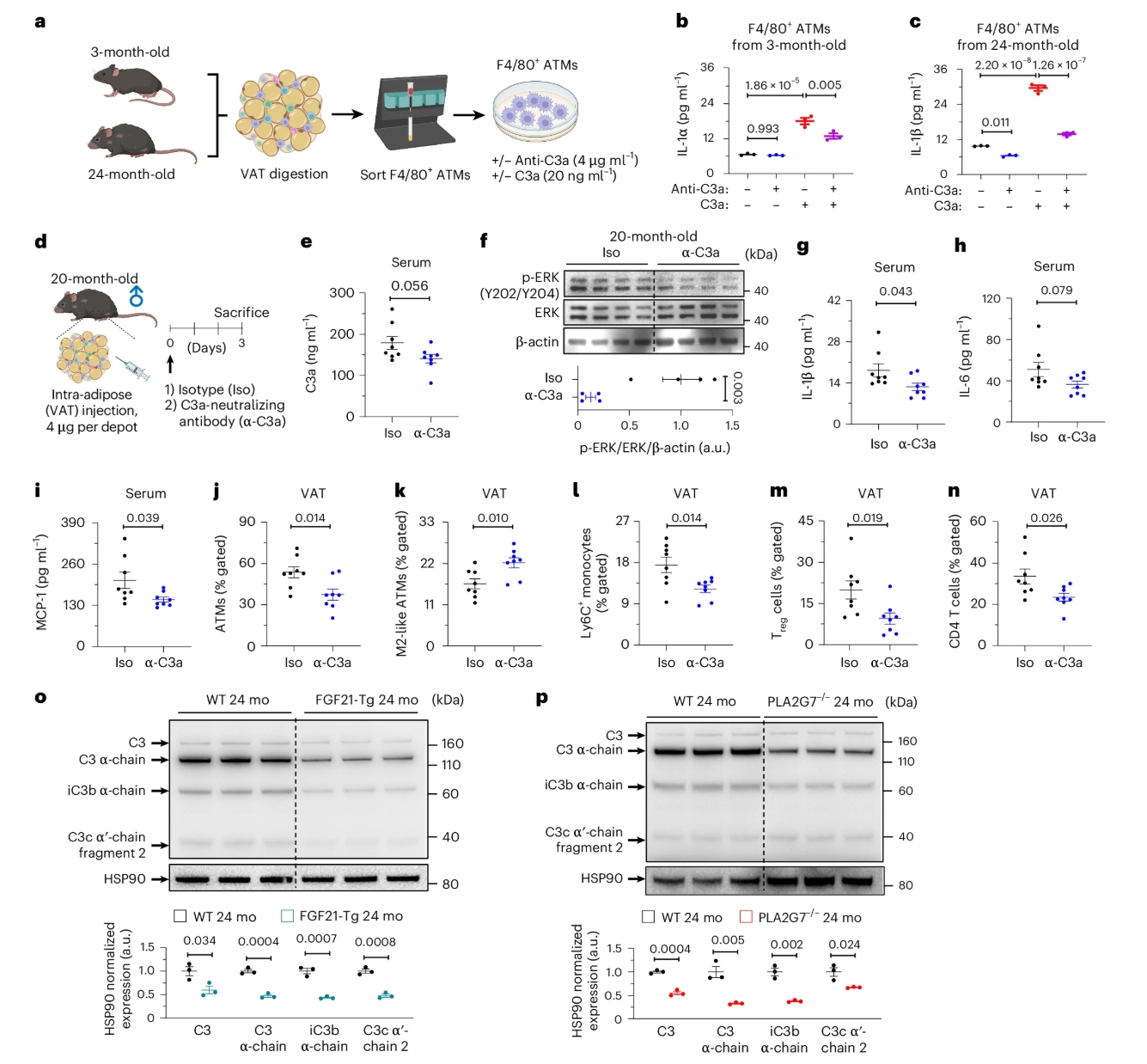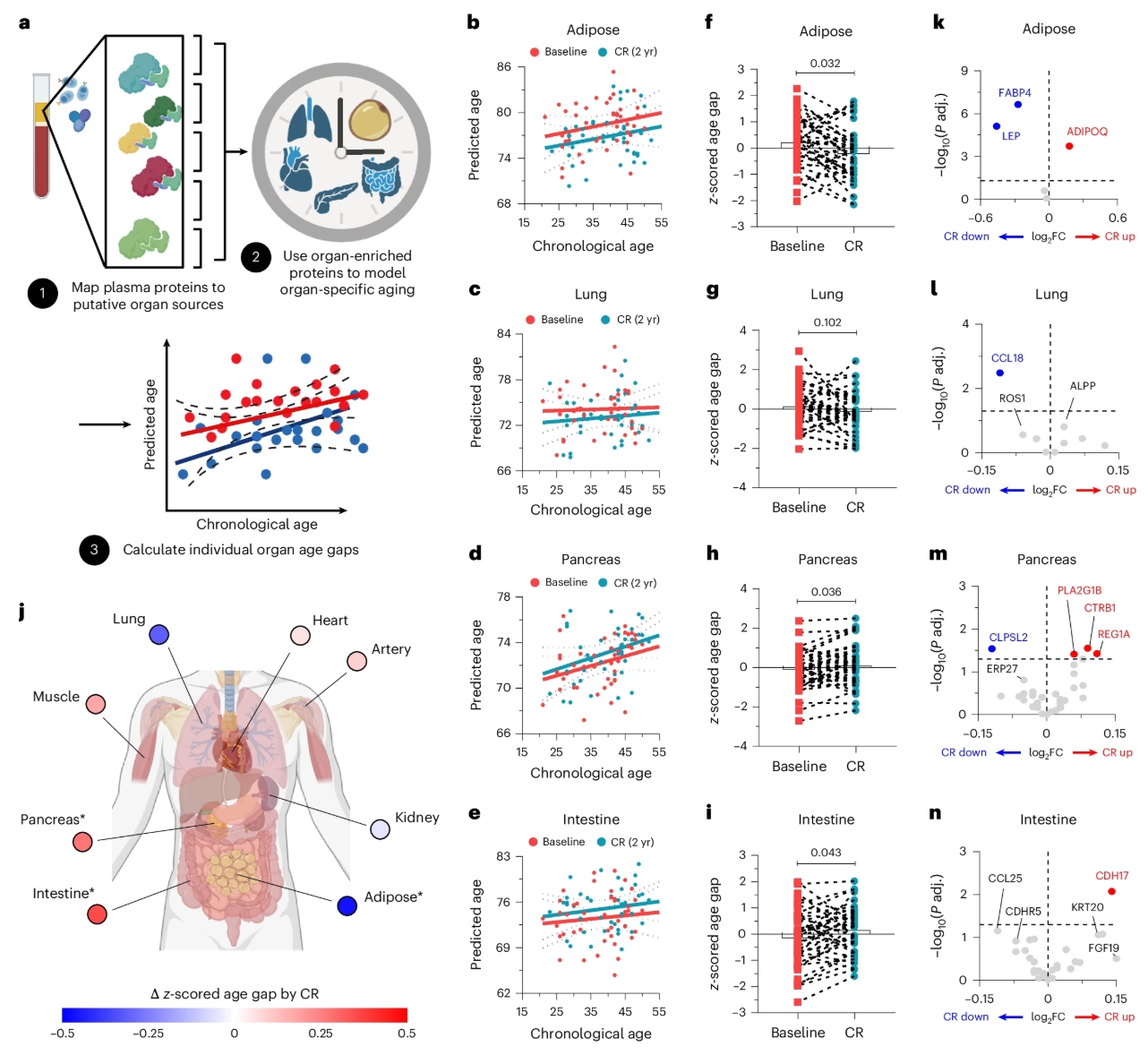 “饿一饿,活得久”——这句话你八成在养生文章里见过。从线虫、果蝇到小鼠和猴子,把饭量减个两三成就延寿一小截,听起来像是进化的铁律。但你有没有好奇过:少吃两口饭,究竟是怎么在分子层面“骗”过衰老时钟的? 4月13日,美国耶鲁医学院的研究团队在《自然·衰老》上发表了一篇研究,首次从人类蛋白质组层面揭开了这个谜底。他们用了两年时间跟踪了42位每天只吃“八分饱”的健康中年人,在血浆里找到了一个很有意思的线索[1]。 早在1935年,美国康奈尔大学的克莱夫·麦凯(Clive McCay)团队就首次用大鼠证实:在保证营养的前提下减少热量摄入,确实能显著延长动物的寿命[5]。此后近百年,热量限制(Caloric Restriction,简称CR)在酵母、线虫、果蝇到小鼠、大鼠和猴子中被反复验证,成为衰老干预领域公认的非药物干预“金标准”。 但过去这些结论大多来自动物实验,对人类有没有同样的效果呢?2018年启动的CALERIE-II临床试验给出了答案——这是首个在健康非肥胖人群中开展的、为期两年的热量限制研究。参与者平均减少了约14%的热量摄入,差不多就是“吃八分饱”。两年后,这批人的胸腺功能增强、代谢指标改善、炎症水平降低[2,3]。简单说,身体的“生物年龄”确实变年轻了。 那么下一个问题来了:热量限制到底是通过什么机制做到这些的? 在新研究中,研究者对42位CALERIE-II参与者的血浆进行了高通量蛋白质组学分析,一口气检测了7000多种蛋白质。结果发现,热量限制后变化最显著的,是一个叫做“补体系统”的免疫通路。 补体系统是什么?通俗来讲,它是我们身体里的一支免疫部队,包含超50种蛋白质,其中的C3蛋白就像一个警报器。年轻时,补体系统只在感染或受伤时才会拉响警报(产生C3a),召集部队清理问题。 但人老了以后,这个警报器会变得过于灵敏,在没有真正威胁时也会持续发出微弱警报,导致身体一直处于“慢性低度炎症”状态,即衰老相关疾病的核心驱动力之一。因此,在老年人身上,C3和C3a水平会显著升高;甚至有研究发现,百岁老人体内C3水平越低,长寿概率越高,这是因为他们的免疫系统机能更健康,不会过度活跃地制造炎症,从而能抵御更多疾病[4]。 研究数据显示,两年热量限制后,参与者血浆中多条补体通路被显著抑制,尤其是C3a的水平大幅下降。最关键的一点是:这种下降与体重减轻无关,也就是说,即便你瘦得不多,只要坚持少吃,C3a依然会降低。 此外,研究人员利用“器官年龄”模型分析还发现,热量限制主要延缓了脂肪组织的蛋白质组衰老时钟,对其他器官影响不大。换句话说,内脏脂肪是热量限制发挥衰老干预作用的主要场所。 那么,血液里升高的C3a到底从哪来? 过去学界普遍认为肝脏是C3的主要合成部位,但这篇研究颠覆了这一认知。通过对比年轻和老年小鼠的多种组织,研究者发现:衰老带来的C3a升高,源头不在肝脏,而在内脏脂肪。实验数据显示,内脏脂肪中C3裂解产物的水平随年龄大幅增加,而肝脏中反而变化不大。 单细胞测序进一步锁定了罪魁祸首——内脏脂肪中的一种特定巨噬细胞亚群,被称为年龄相关巨噬细胞。这群细胞在老年小鼠的内脏脂肪中大量扩增,但有意思的是,它们并不表达p16和p21这些经典的“细胞衰老”标志物。也就是说,它们不是那些已经“死气沉沉”的衰老细胞,而是住在大肚腩里的一群“不衰老但就爱搞事”的邻居。 这群“坏邻居”通过一条“C3a-C3AR1-ERK”自分泌信号通路,持续自我激活,源源不断地释放促炎因子——IL-1β和IL-6等炎症因子随之升高,把整个脂肪组织变成了一座日夜冒烟的“炎症工厂”。这也解释了为什么肚子大的人往往炎症水平更高、老得更快,因为内脏脂肪不只是储存能量的仓库,更可能是驱动全身衰老的炎症策源地。 既然找到了肇事者,下一步就是验证能不能把它“关掉”。研究人员给20个月大的老年小鼠(相当于人类60岁左右)的内脏脂肪直接注射了C3a特异性中和抗体。结果相当干脆:短短3天后,血清中的关键炎症指标IL-1β和MCP-1显著下降;脂肪组织内的免疫环境也明显改善,促炎细胞减少,抗炎细胞增加。 更令人信服的是交叉验证。研究者还检测了另外两种已知能延长寿命的基因改造小鼠模型:FGF21过表达小鼠和PLA2G7缺失小鼠。结果表明,在这两种长寿模型中,C3a的水平同样显著低于同龄对照组。早在2022年就有研究发现,CALERIE-II参与者的PLA2G7基因表达下降,而该基因在小鼠中被敲除后可以部分模拟热量限制的抗炎效果。 这意味着:热量限制、FGF21过表达、PLA2G7缺失三种不同的长寿干预手段,最终都指向了同一个分子节点——C3a降低。就好像不同路径上的人,在同一个交叉路口汇合了。 冷静来看,补体系统是免疫防线的重要组成部分,长期完全关闭无疑会增加感染风险。不过论文也给这个矛盾留了一个出口:也许我们不必把补体彻底“关掉”,只要把“老年的过度激活”降回健康的基线水平就够了。而这个目标,离临床应用可能并不遥远。 对于我们普通人来说,哪怕只是每顿饭少吃几口,坚持下来就能在分子层面降低你的“炎症年龄”。当然,少吃不是“饿肚子”,而是要在保证营养均衡的前提下适度减少,绝不是节食或营养不良。其实,与其纠结每顿饭吃七分饱还是九分饱,身体里还有没有“慢性炎症”这个指标,可能才是更值得操心的事。 总之,“少吃两口饭”的衰老干预效果,未必