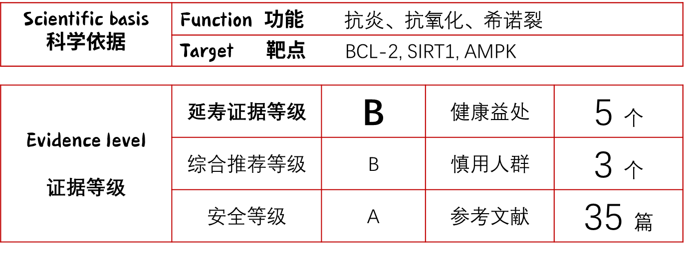 根据长寿之家 Changshou.com制定的《长寿成分评级标准(2025 版)》,漆黄素的延寿证据等级为 B。