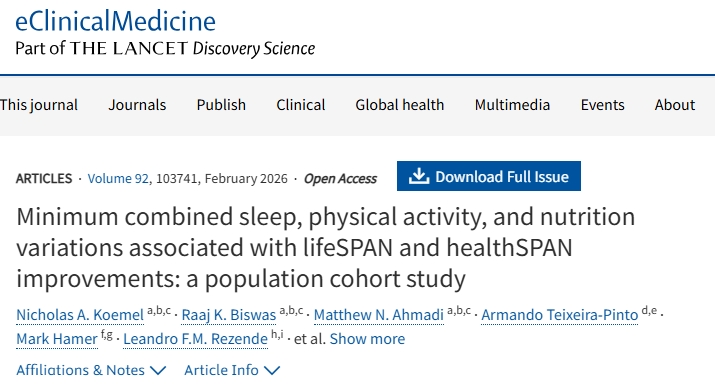 [2] Koemel NA, Biswas RK, Ahmadi MN, et al. Minimum combined sleep, physical activity, and nutrition variations associated with lifeSPAN and healthSPAN improvements: a population cohort study. EClinicalMedicine. 2026;92:103741.