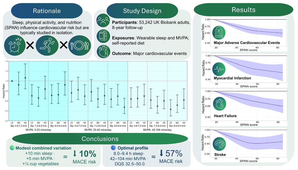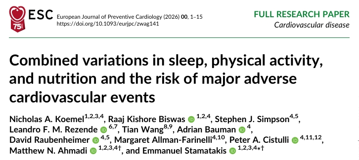 [1] Koemel NA, Biswas RK, Simpson SJ, et al. Combined variations in sleep, physical activity, and nutrition and the risk of major adverse cardiovascular events. European Journal of Preventive Cardiology. Published online March 23, 2026.