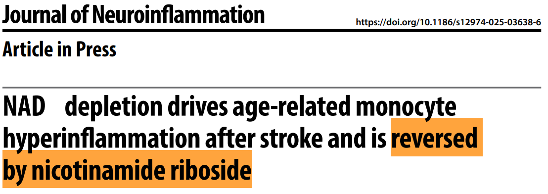 [1] Cabrera, M. et al. NAD+ depletion drives age-related monocyte hyperinflammation after stroke and is reversed by nicotinamide riboside. Journal of Neuroinflammation (2025) doi:10.1186/s12974-025-03638-6.