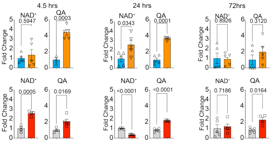 老年小鼠在中风后24小时,其循环单核细胞内的NAD+水平显著降低,同时伴随神经毒性代谢物——喹啉酸(QA)的异常积累。QA本是NAD+合成通路(Kynurenine途径)中的中间产物,正常情况下应进一步转化为NAD+前体NaMN。