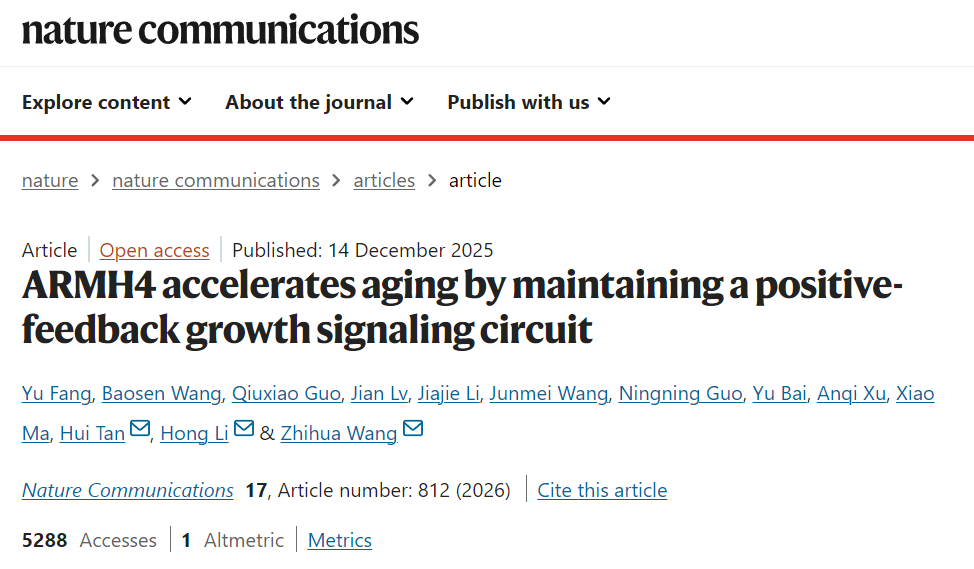 [1] Fang Y, Wang B, Guo Q, et al. ARMH4 accelerates aging by maintaining a positive-feedback growth signaling circuit. Nature Communications. 2025;17(1):812.