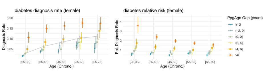 此外,研究还发现,排除了年龄、性别、体重等传统因素,PpgAge Gap差值可作为预测未来心脏病与糖尿病的独立风险指标,其影响甚至超过高血压或高胆固醇病史。具体来说,PpgAge Gap > 6年的人群,糖尿病患病风险达到平均的 2.38倍,心脏病风险更是飙升至 3.46倍[1]。