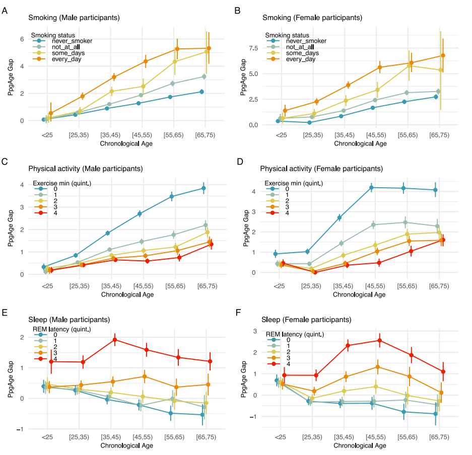 • 吸烟:吸烟越多,PpgAge Gap越大。年轻时不明显,但随着年龄增长,差距会拉大到3岁以上;