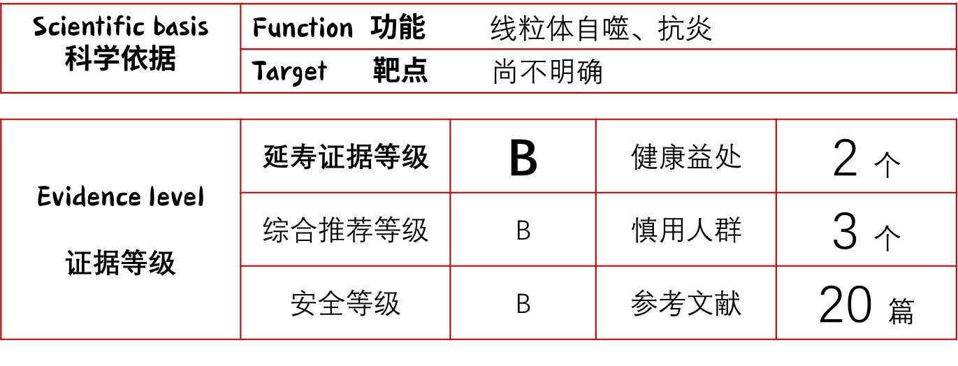 根据长寿之家Changshou.com制定的《长寿成分评级标准(2025 版)》,尿石素 A 的延寿证据等级为B。