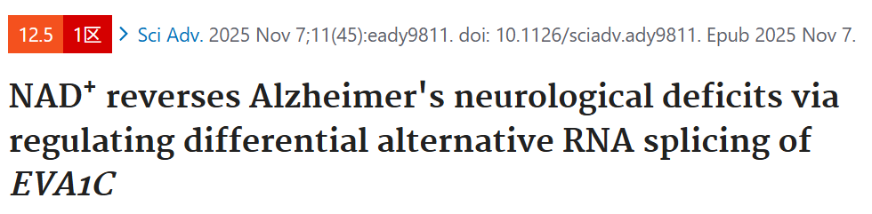 [1] Ai, R. et al. NAD + reverses Alzheimer’s neurological deficits via regulating differential alternative RNA splicing of EVA1C. Science Advances 11, eady9811 (2025).