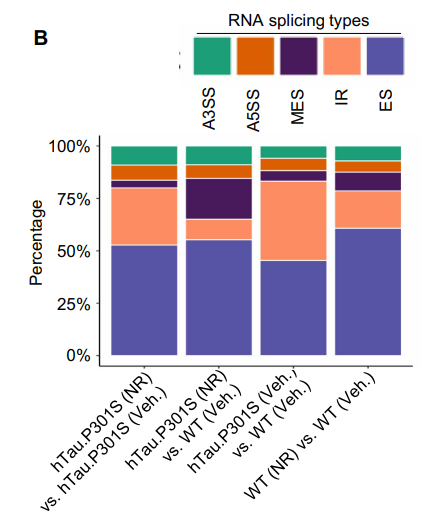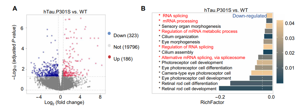 科学家通过转基因手段制备了AD小鼠模型,以Tau蛋白过度磷酸化为病理特征,和健康野生型小鼠的海马体组织进行了RNA测序分析,结果发现:与野生型小鼠相比,AD小鼠海马体中下调的基因多与RNA剪接调控过程相关,这说明RNA剪接异常是AD小鼠病理特征的标志性表现。