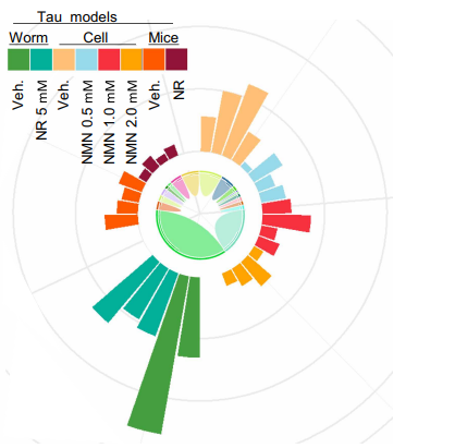 近年来诸多研究发现,在哺乳动物中补充NAD+的前体物质(如烟酰胺核苷NR/烟酰胺单核苷酸NMN)展示出了对AD不同程度的改善功能[3-6],还有多项人体临床试验正在进行中。