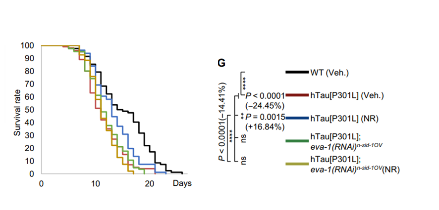 研究人员发现,2 mM的NR喂养,可以将AD线虫的寿命延长16.84%(下图中蓝色曲线和红色曲线对比)。但是如果把线虫中与人EVA1C同源基因eva-1敲除,并未观察到NR对于寿命的延长作用(深绿和浅绿曲线),这说明NR起作用是依赖EVA1C基因的。
