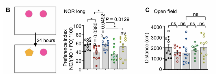 接着在行为学实验中,研究人员发现:接受NAD+前体处理的AD模型小鼠,在“新物体识别”测试中表现出显著更好的记忆能力。意料之中,如果EVA1C被敲除,NAD+就无法发挥作用。