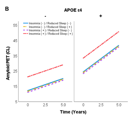 淀粉样蛋白(Amyloid, Aβ)是被公认的“痴呆蛋白”,它在脑中的沉积是阿尔茨海默病的早期信号。梅奥诊所的研究人员通过PET扫描发现,失眠的人,大脑中的淀粉样蛋白水平显著更高,其影响程度甚至不亚于阿尔茨海默病基因APOE ε4携带者。