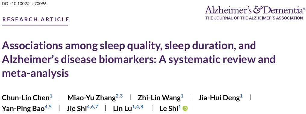 [3]Chen, C. et al. Associations among sleep quality, sleep duration, and Alzheimer’s disease biomarkers: A systematic review and meta‐analysis. Alzheimer S & Dementia 21, (2025).