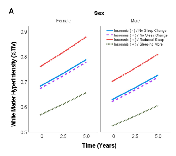 梅奥诊所的研究也印证了这一点。在失眠人群中,那些 “睡眠时长少”的人,大脑健康状况更加糟糕;而那些虽然失眠但“睡得更多”的人,其脑血管病变(WMH)的负担相对较轻。