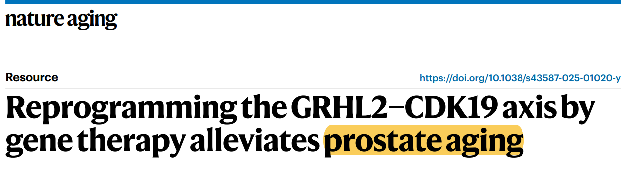 [1] Sun, G. et al. Reprogramming the GRHL2−CDK19 axis by gene therapy alleviates prostate aging. Nature Aging (2025) doi:10.1038/s43587-025-01020-y.