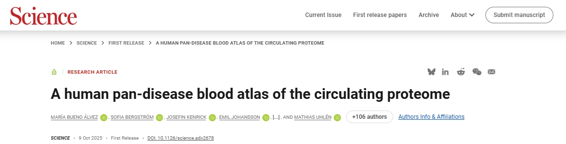 Álvez MB, Bergström S, Kenrick J, et al. A human pan-disease blood atlas of the circulating proteome. Science. October 2025:eadx2678.
