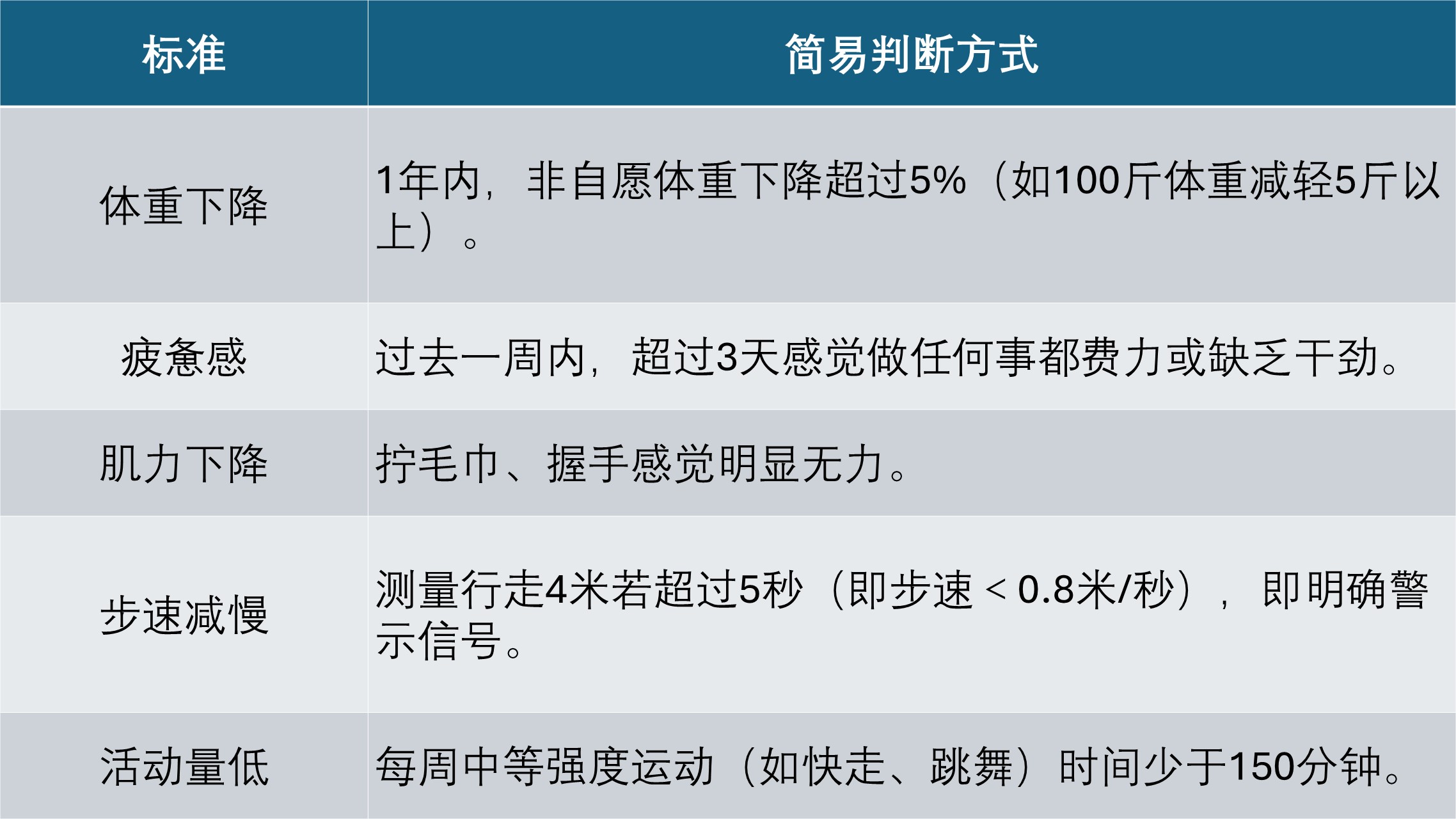 退休后享受悠闲生活是大多数人的期盼,但许多刚退休的人总感觉精力不济,以前“一口气上五楼不费劲”,如今却气喘吁吁、腰酸腿疼,只能感叹“衰老来得太快了”。 然而,一项涉及超177万人的大型研究发现,这种变化并不是简单的“衰老”——失去规律的工作节奏、富有挑战的认知刺激以及日常的社会交往,可能共同削弱了身体的生理储备功能,导致身体滑向“衰弱”状态[1]。 衰弱和衰老,一字之差,谬以千里。今天长寿之家changshou.com将和你一起解密“衰弱”的真相。 衰弱不同于正常的衰老。正常的衰老是缓慢的、渐进的,而衰弱则意味着生理储备能力的加速衰退,导致身体的抗应激能力大幅下降。它不只是“没劲儿”,更是多系统生理功能失调的综合体现,直接关系到老年人的生活质量与健康寿命。 目前,医学界广泛采用“Fried衰弱表型标准” (见下表)来识别衰弱。它涵盖了五大指标,满足其中3项即可判定为衰弱,而出现1-2项,则属于衰弱前期,也是逆转衰弱的黄金窗口[2]。 如果觉得上表覆盖的情况不详尽,也可以试试北京大学公共卫生学院此前发表过的改良版衰弱指数量表。 一旦步入衰弱状态,就如同推倒了第一块多米诺骨牌,一系列不良健康事件的风险将显著增加。 一项涵盖中国、英国、美国三国人群的研究显示,与保持健壮的人相比,从健壮状态恶化为衰弱前期或衰弱的人,新发心血管疾病的风险分别增加了84%、53%和59%[3]。 衰弱者骨骼肌肉系统功能下降,平衡能力变差,跌倒及其引发的骨折风险显著增加[4]。 认知功能下降的速度与衰弱呈正相关。大脑海马体的神经元突触功能、线粒体功能受损等衰老变化,是认知下降和痴呆的重要病因[5]。 衰弱者的免疫系统可能应对日常尚可,却难以妥善处理应激。表现为异常的炎症反应,如对炎性刺激过度反应,或炎症清除后反应仍持续[6]。 衰弱老人是医院急诊和住院的常客,其住院时间延长,术后并发症更多,死亡率也更高。 需要强调的是,衰弱并非衰老的必然结果,即使到了高龄,许多人也不会变得衰弱。那么,人为什么会衰弱?《新英格兰医学杂志》上发表的一项综述总结:衰弱的发生,源于微观层面多个系统的交互紊乱[7]。 衰老的免疫系统及脂肪细胞等会持续释放促炎因子(如IL-6、TNF-α),使身体处于长期、低度的炎症状态。这种慢性炎症会抑制生长因子的表达、加速身体组织的分解代谢,特别是肌肉的分解,直接导致肌少症和疲惫感,成为衰弱的基石。 随着年龄增长,一些细胞因DNA损伤、氧化应激等进入了“衰老”状态,就像“僵尸”一样,虽不再正常分裂,却异常活跃,不断向周围环境释放大量促炎信号和各种有害分子,“污染”健康细胞,加剧慢性炎症,是推动衰弱和多种老年病的元凶之一。 目前,科学家正在研究能选择性清除这些“僵尸细胞”的希诺裂(senolytics)药物,并在动物实验中已展现出逆转衰老相关疾病的潜力。 线粒体是细胞的“能量工厂”,其功能衰退导致能量产出不足,机体自然会感到持续性的疲劳和力不从心。同时,这种故障还会产生的更多“废料”(活性氧),加剧氧化应激,进一步损伤细胞,形成恶性循环。 我们的身体有一个精密的系统来感知和调度营养,主要涉及mTOR(营养充足传感器)和AMPK、Sirtuins(营养匮乏传感器)等通路。在衰弱状态下,这个“调度中心”很可能会失灵。研究表明,通过热量限制或某些药物(如雷帕霉素、二甲双胍)来调整这些通路,有望改善肌肉质量和功能。这说明,营养感应失调是衰弱的一个核心驱动因素。 衰老伴随着体内激素水平的剧变:促进合成的“建设激素”(如睾酮、生长激素)减少,而促进分解的“破坏激素”(如皮质醇)可能相对增多。此消彼长之下,身体建设肌肉变得困难,而组织分解却更容易,导致身体在应对疾病、跌倒等压力时,恢复能力(即“韧性”)大幅下降。 尽管衰弱的机制复杂,但我们并非束手无策。四川大学华西医院的研究人员发现,衰弱是一个动态变化的过程,识别其不同的发展轨迹并在衰弱前期进行早期干预,是延缓其进展的关键[8]。 换句话说,通过以下多维度干预,完全可以有效延缓衰弱进展,甚至能够逆转衰弱[4]。 抗阻训练:直接刺激肌肉蛋白质合成,是改善肌肉力量和功能的基石。可从举小哑铃、弹力带练习、坐椅起立等开始。 身心运动:太极拳、八段锦、易筋经等传统功法,被研究证实能显著改善平衡、步行速度和生活质量,且安全易坚持[9]。 有氧运动:快走、慢跑、游泳等有助于提升心肺功能和线粒体效率。 足量优质蛋白:确保摄入足够的蛋白质,如鱼肉、瘦肉、禽类、鸡蛋、豆制品等,为肌肉提供合成原料。 抗炎饮食:多摄入丰富的新鲜蔬果、坚果,其富含的维生素C、E及多种植物化学物有助于对抗炎症和氧化应激。推荐地中海饮食模式。 维生素D补充:在医生指导下适量补充维生素D,对延缓衰老有益。 慢病管理:有效控制高血压、糖尿病等基础疾病,减少其对身体的持续冲击。 用药审查:在专业医生或药师指导下,定期审查用药,减少不必要或可能加重衰弱的药物。 认知与社会参与:积极的脑力活动(如阅读、下棋)和丰富的社交,有助于维持认知功能和心理健康。 注意:衰弱不仅限于老年人,也可能存在于60岁以下人群中,尤其是多病患者(两种或以上疾病共存)。因此,早识别身体发出的衰弱信号,并及时干预,不仅能收获理想中的退休生活,