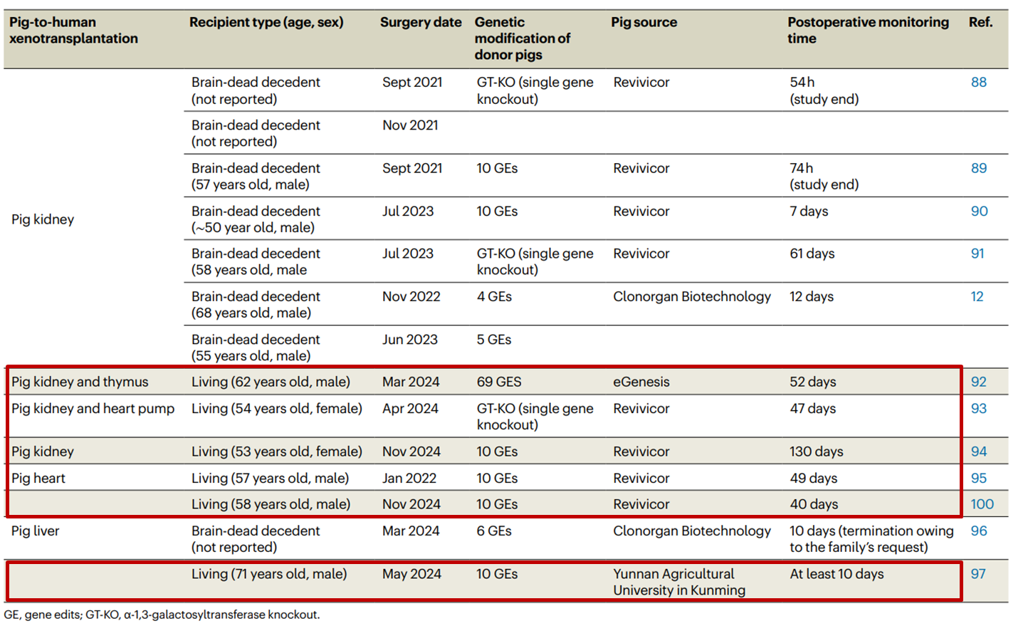 目前,全球共完成了6例活体异种移植临床试验[9],已成功将猪心脏、猪肾脏、猪肝脏替换到人体当中。其中世界首例基因编辑猪肝脏活体移植,于去年5月由我国科学家完成。